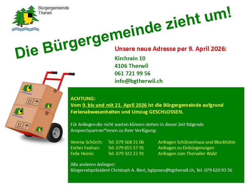 Die Bürgergemeinde zieht um! Geschlossen 9.-13.4.2026