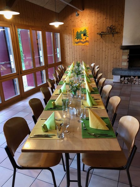 Ein Cheminéegrill, ein Holzofen, zwei rollstuhlgängige Toiletten sowie ein grosser Gasgrill aussen (Miete CHF 100.00) vervollständigen die Einrichtung. Ausserdem stehen auch Festbankgarnituren für den Aussenbereich zur Verfügung. Parkplätze sind ebenfalls vorhanden.